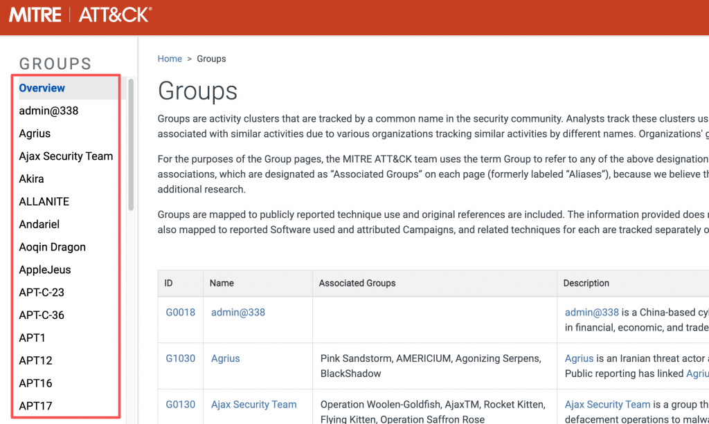 进入 MITRE 的 Groups 页面后,左侧会显示一个列表菜单,可以: