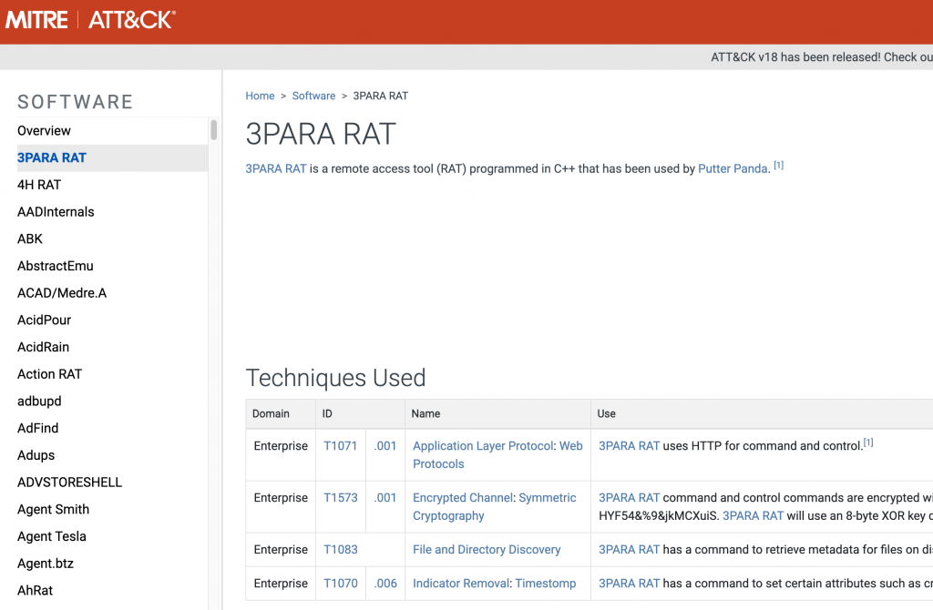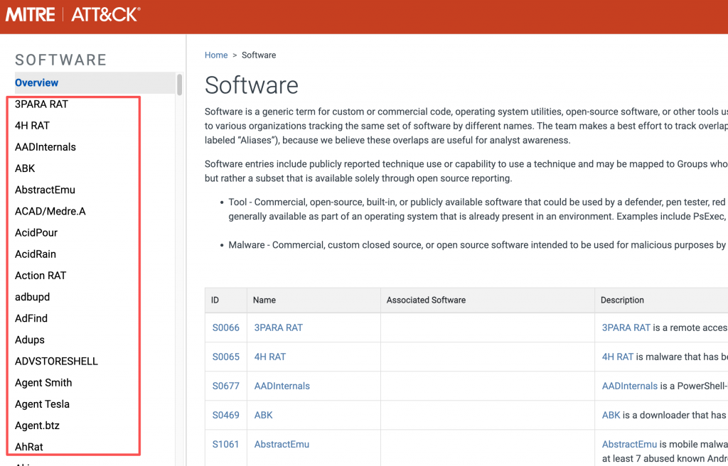 软件是为数字系统运行而开发的程序。在 MITRE ATT&CK 框架的 “Software” 中,重点收录了 APT 组织使用的各种软件,包括:
