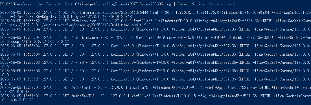 Get-Content -Path "C:\inetpub\logs\LogFiles\W3SVC1\u_ex250605.log" | Select-String -Pattern "web"