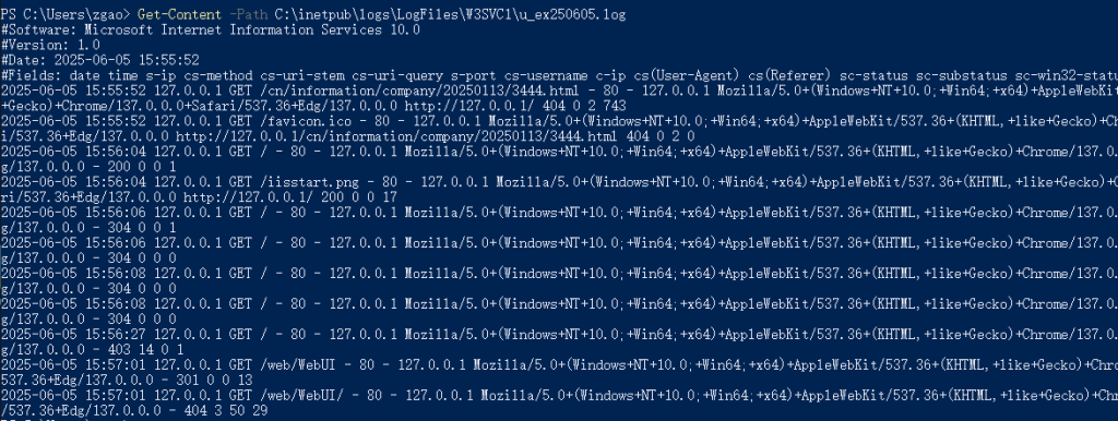 Get-Content -Path "C:\inetpub\logs\LogFiles\W3SVC1\u_ex250605.log"