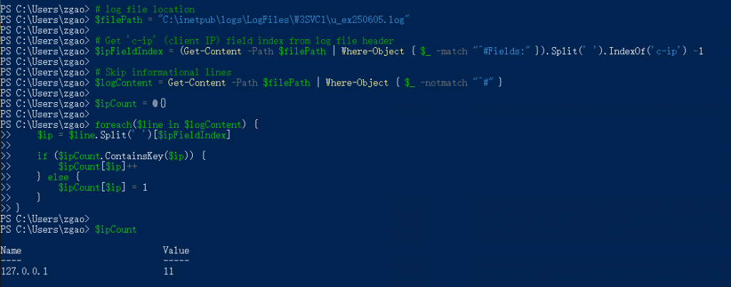 $filePath = "C:\inetpub\logs\LogFiles\W3SVC1\u_ex250605.log"