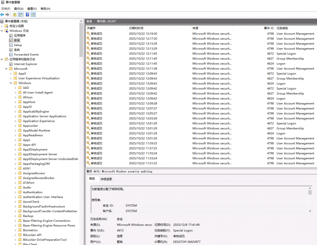 记录来自 Windows 应用程序的错误、警告以及其他事件。应用程序会将需要通知用户或系统管理员的情况写入此日志。如果发生“应用程序崩溃、WAF 拦截、WebShell 注入失败日志”等情况,通常首先检查 Application Log 以寻找程序异常根因。