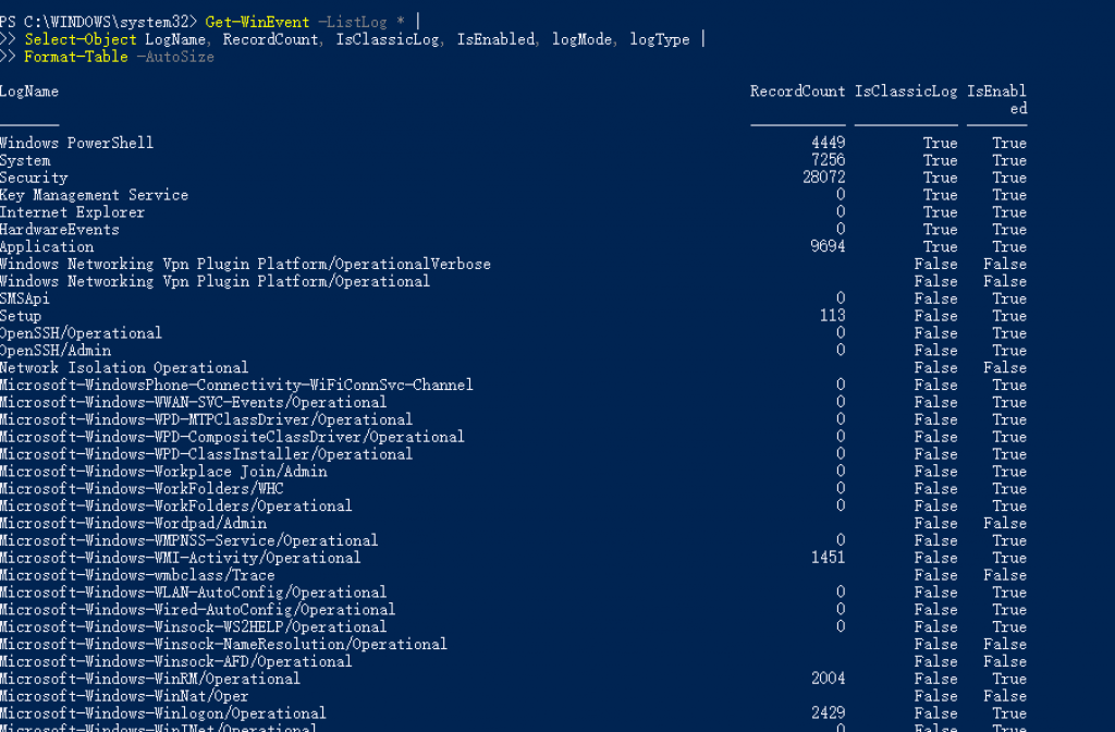 Get-WinEvent -ListLog * | Select-Object LogName, RecordCount, IsClassicLog, IsEnabled, logMode, logType | Format-Table -AutoSize
