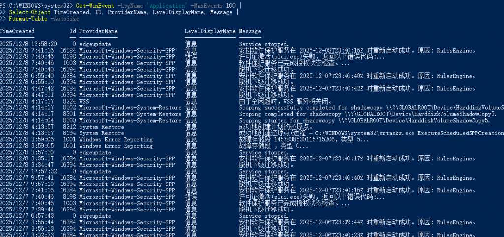 Get-WinEvent -LogName 'Application' -MaxEvents 100 | Select-Object TimeCreated, ID, ProviderName, LevelDisplayName, Message | Format-Table -AutoSize
