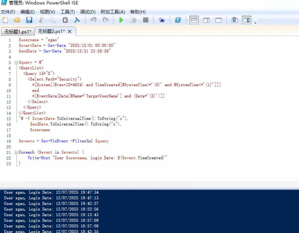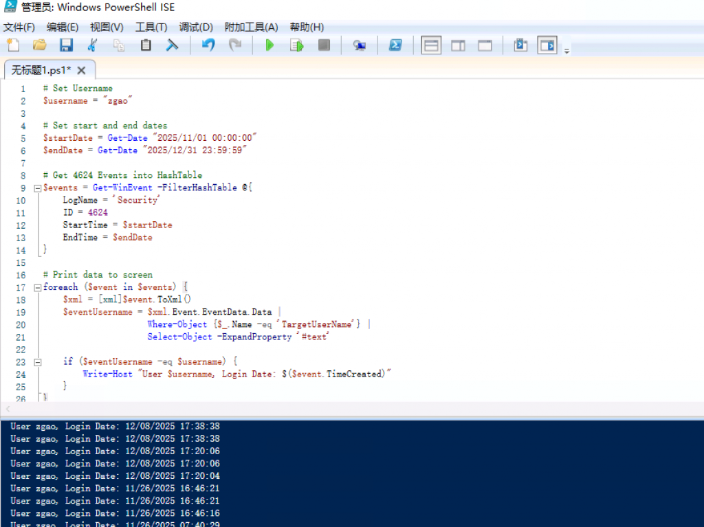 PowerShell 脚本:列出某用户在指定日期范围内的登录记录。