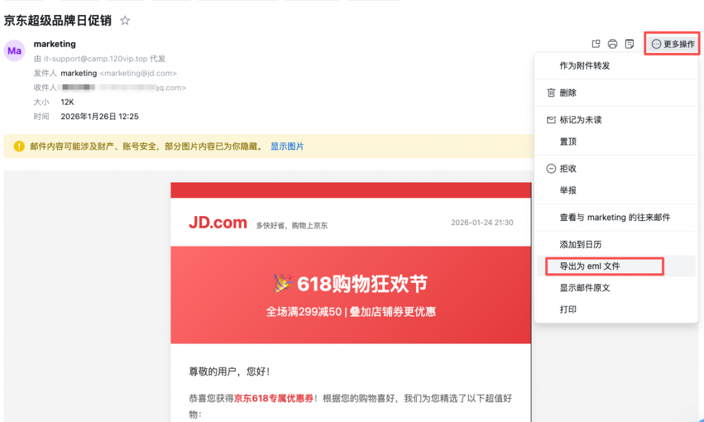 这里以QQ邮箱为例,打开目标邮件点击右上角更多操作,下载邮件原始文件(.eml)。