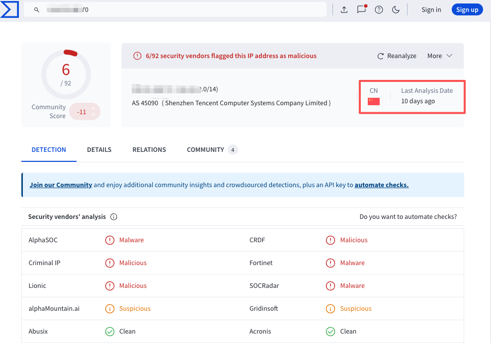 除了分析链接和附件本身,邮件的 SMTP 来源 IP 也是静态分析中非常有价值的一环。通过查询威胁情报平台,可以了解: