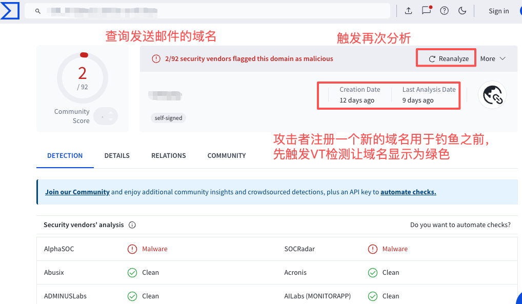 - 攻击者在域名部署初期,主动提交到 VirusTotal