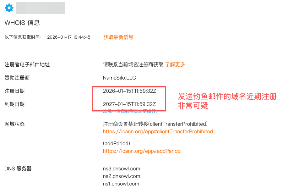 因此,在静态分析阶段,只要发现邮件中的域名注册时间很短,就应该立刻提高警惕。这并不一定意味着“100% 恶意”,但这是一个非常值得继续深挖的信号。