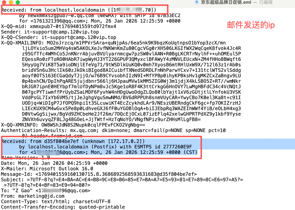 Received 记录了邮件在投递过程中经过的每一跳服务器,也就是这封邮件“走过的路”。在应急分析中,我们通常会从最底部开始,逐层向上还原邮件的真实来源。