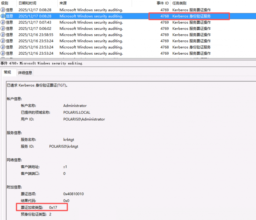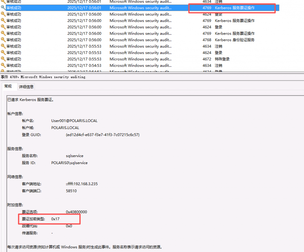 - 紧接着出现 Event ID 4769,同样使用 0x17 加密