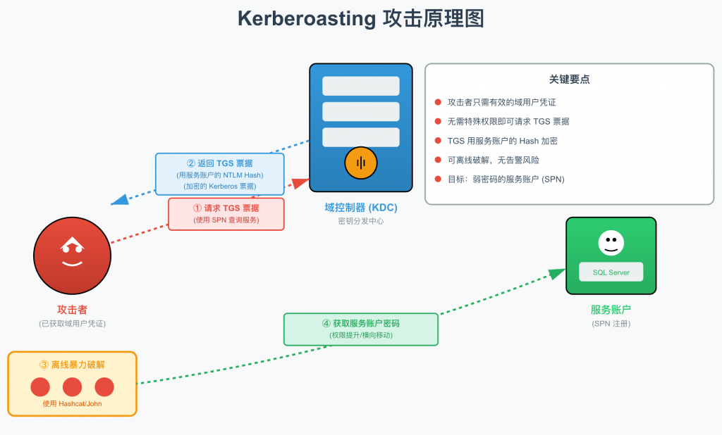 攻击者向域控制器请求某个服务的 Kerberos Service Ticket(TGS),然后将返回的票据离线破解,从而尝试还原该服务账号的明文密码。