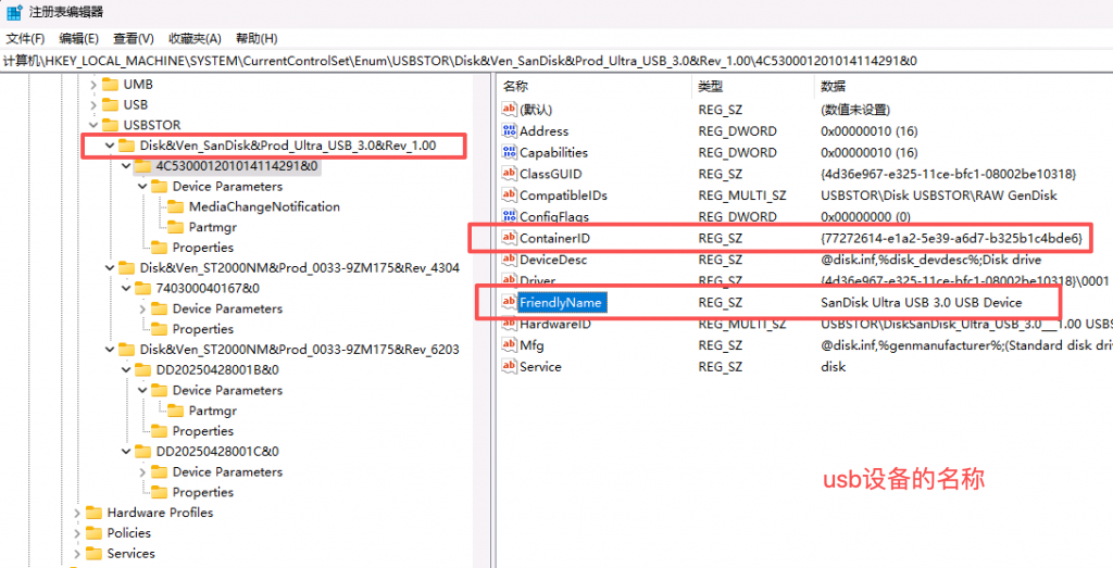 当系统第一次识别某个 USB 存储设备时,USBSTOR 下会生成对应的子键。这些子键名称看起来通常是随机字符串,但实际上对应的是设备在系统中的标识信息。