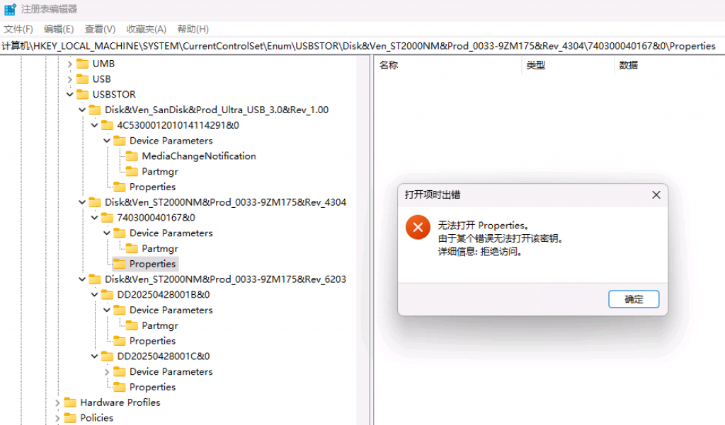 在 USBSTOR 相关子键下,继续向下展开,可以找到 Properties 目录。用系统自带的注册表工具无法正常查看,需要使用RegistryExplorer打开。