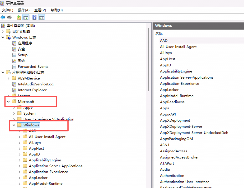 事件查看器 → 应用程序和服务日志 → Microsoft → Windows