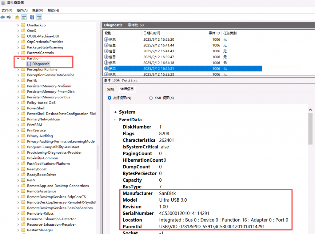 Partition 日志:确认磁盘级别的 USB 设备