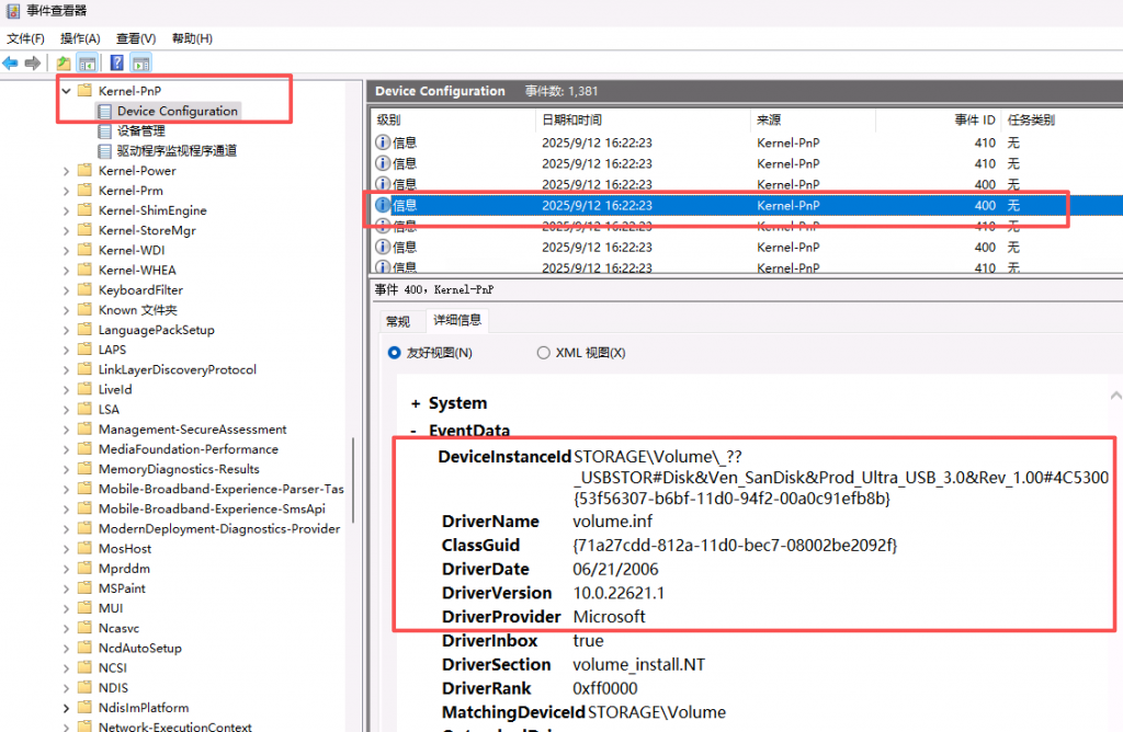 其中,Event ID 400 尤其关键,它表示:系统成功为一个外接设备完成配置(也就是驱动加载)。