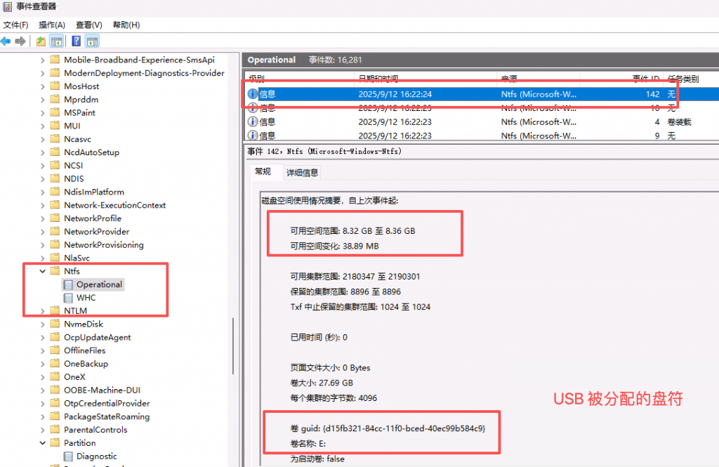 仅知道 USB 插入过,还不够。在数据泄露调查中,更重要的是:文件路径里出现的盘符,是否真的来自这个 USB?这时候,就需要用到 NTFS Operational 日志。