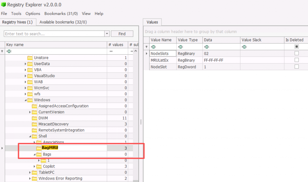 NTUSER.DAT\Software\Microsoft\Windows\Shell\BagMRUNTUSER.DAT\Software\Microsoft\Windows\Shell\BagsUSRCLASS.DAT\Local Settings\Software\Microsoft\Windows\Shell\BagMRUUSRCLASS.DAT\Local Settings\Software\Microsoft\Windows\Shell\Bags