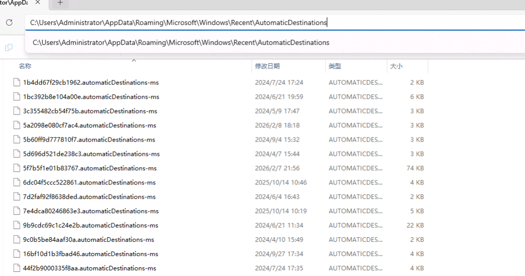 Jump Lists 是 Windows 从 Windows 7 开始引入的一项功能,用于在开始菜单、任务栏中,快速展示某个程序“最近使用的文件”。从取证角度看,你可以把它理解为:“按应用维度记录的历史文件访问清单”它不是日志,也不是注册表,而是一组独立存在的二进制取证文件。