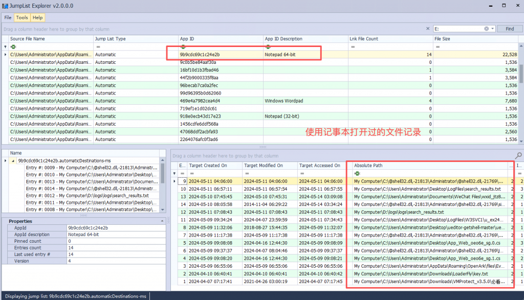 在 USB 事件中,Jump Lists 最有价值的地方在于:它直接记录“某个文件,被某个程序,在某个时间点打开过”。典型可提取信息包括: