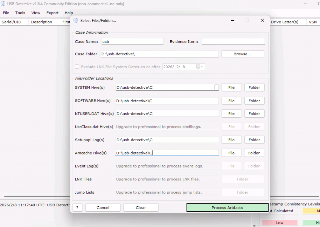 这里使用的自动化工具是 USB Detective。它的核心能力很简单,但非常实用:自动解析与 USB 相关的所有常见取证痕迹,并按设备维度整理结果。这样我们需要做的事情只有一件:提供已经采集好的取证数据(如注册表、日志等)。剩下的事情由工具完成。